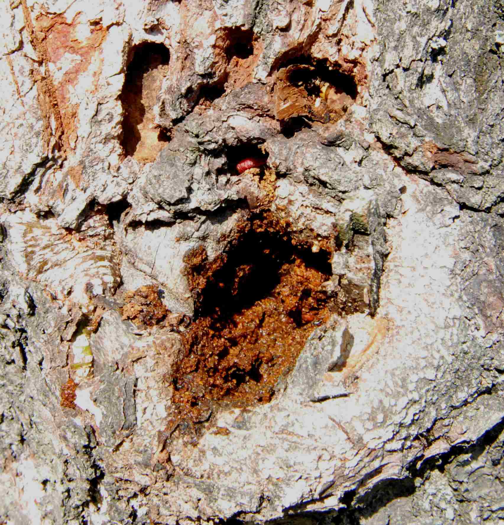 Wyciek soku powodowany przez trociniarkę czerwicę. W tym wycieku znalazłem 4 larwy i 8 poczwarek Ferdinandea sp. oraz bardzo wiele towarzyszących im larw chrząszczy z rodziny Nitidulidae.