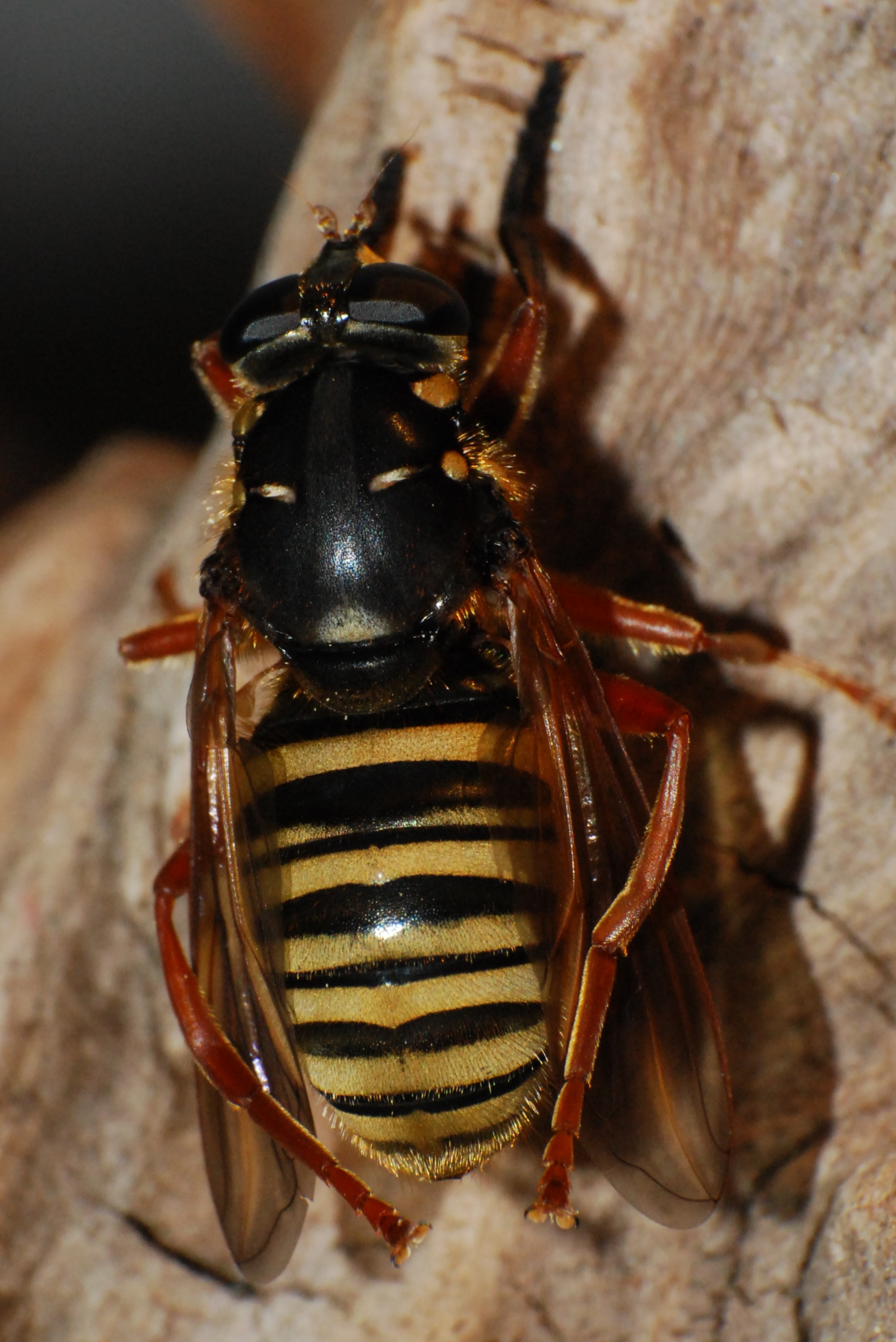 W lesie rozglądałem się za ściętymi sosnami, gdzie zgodnie z podpowiedzią Rafala należało spodziewać się Chalcosyrphus piger, który to byl głównym obiektem moich poszukiwań, choć nadziei nie robilem sobie wielkich. Na większości sosnowych stosow pustki, ale jeden okazał się wyjątkowy. Nie wiedzieć czemu to na nim toczyło się leśne owadzie życie; przekraski dobieraly się w pary, szeliniaki leniwie wygrzewaly się w Słońcu, krzątały się liczne Xylophagus ater, był jakiś ciekawy biegacz, Prosternon, dociekliwe Braconidae oraz zwyczajowi bywalcy - Ampedusy i Rhagium. A także Chalcosyrphus piger, jeśli dobrze rozpoznaję. Lekko się zawiodłem, Ch. valgus robi jednak większe wrażenie.